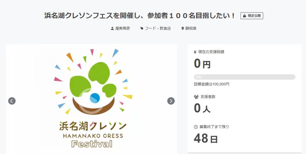 今回、イベント開催をすることが初挑戦となります。右も左もわからない中でなんとか奮闘していきたいと思っております。参加者100名前後が今後継続的にフェスを開催するために必要なラインになります。リターンは主に、浜名湖クレソンの返礼 及び 御礼メッセージとなります。